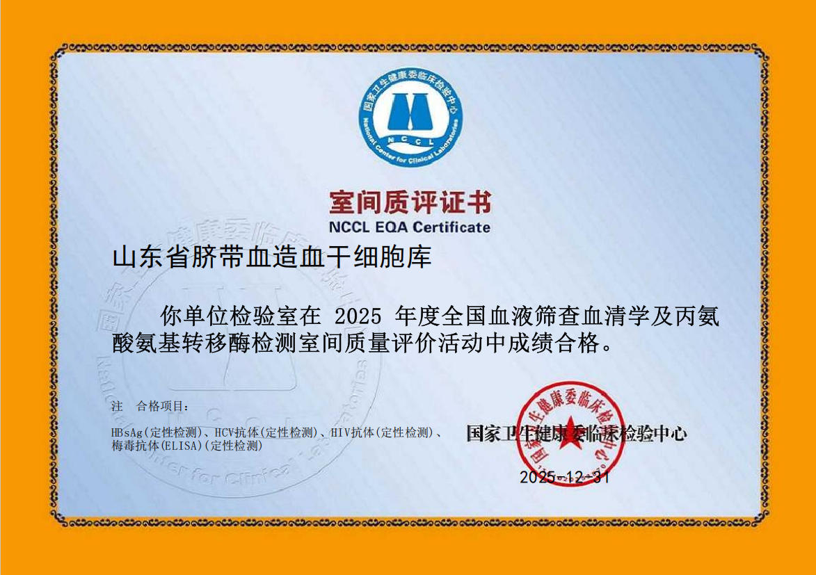 血液筛查血清学及丙氨酸氨基转移酶检测室间质评证书