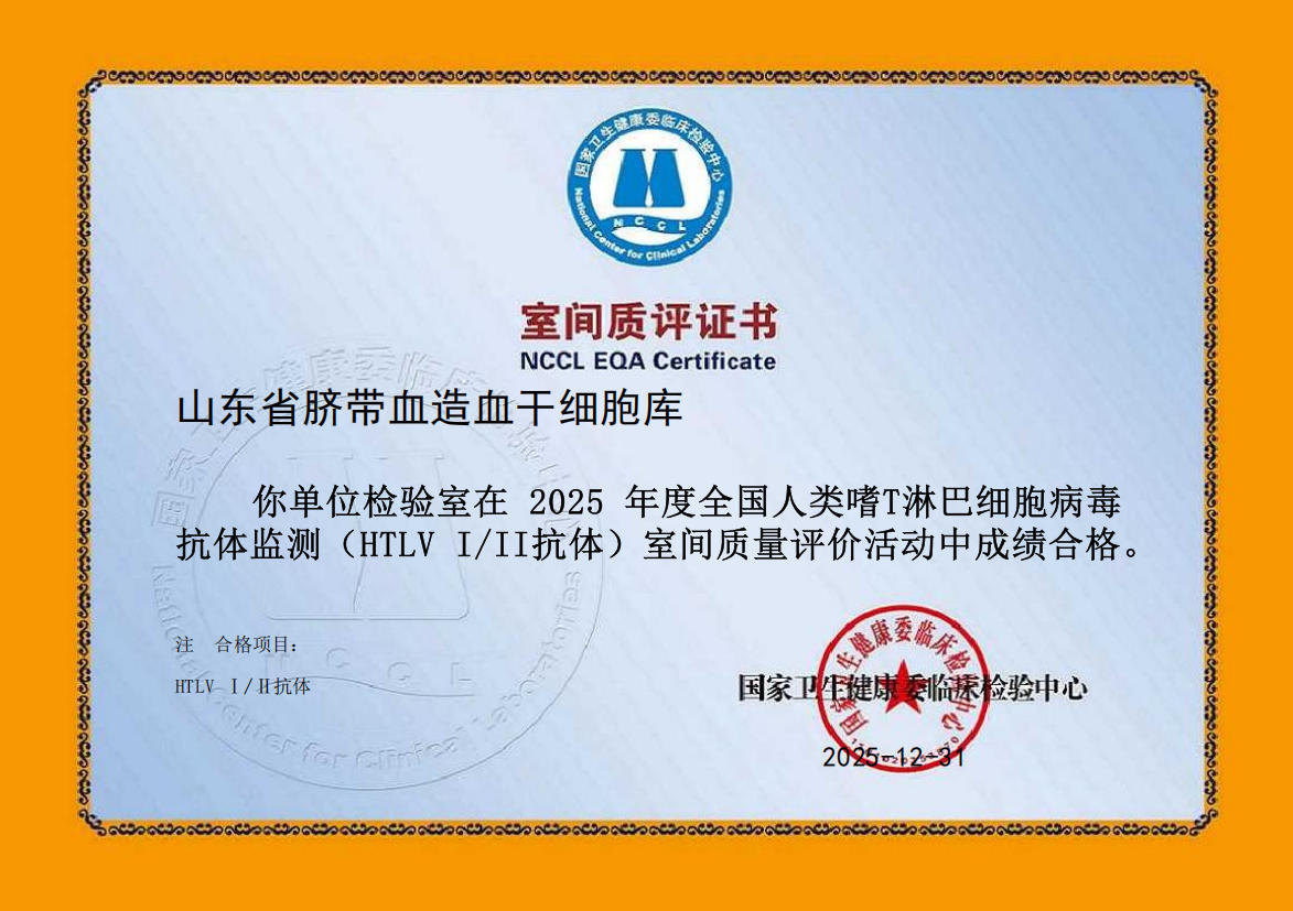 全国人类嗜T淋巴细胞病毒抗体监测(HTLVI/II抗体)室间质评证书