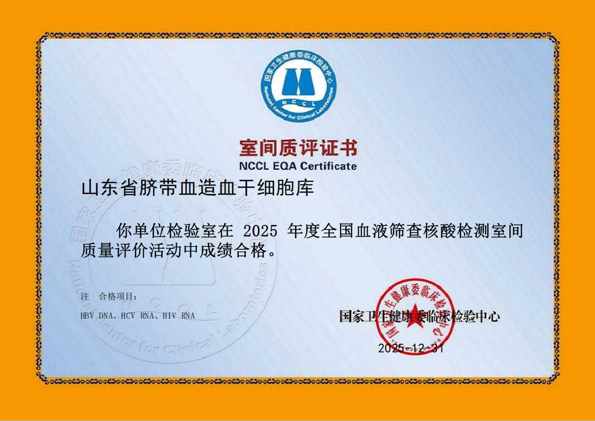 山东省“临床检验专业医疗质量控制指标”室间质量评价证书