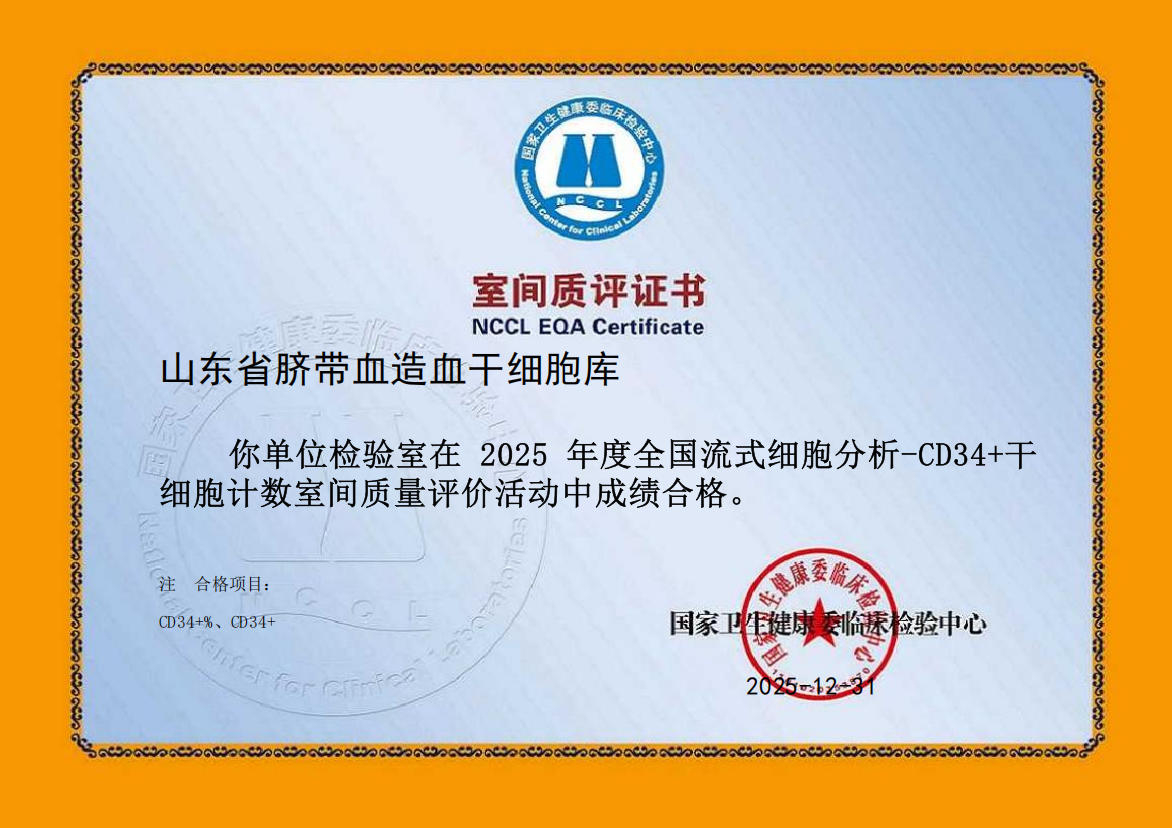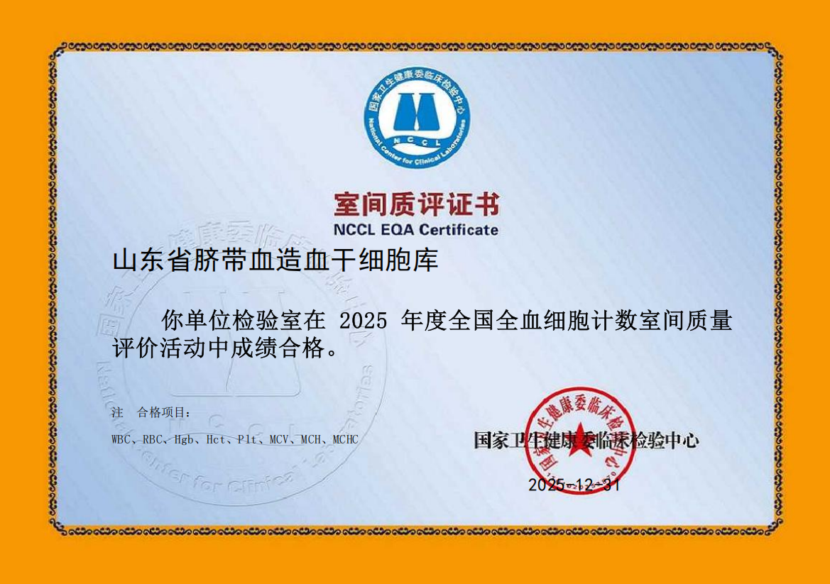 山东省全血细胞计数检验室间质量评价证书