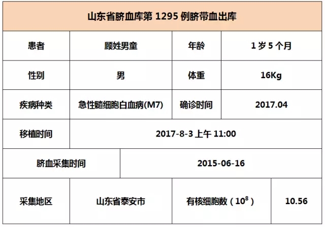 2017年8月3日上午11:00,1岁5个月顾姓男童因患急性髓细胞白血病(M7),在广州某三甲医院接受了单份脐带血移植。参与本次移植的脐带血与患者8/10位点相合,有核细胞数为10.56*10^8。整个输注过程很顺利,无不良反应,愿患者早日恢复健康。