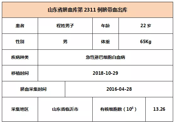 2018年10月29日,22岁程姓男子因患急性淋巴细胞白血病,在安徽某三甲医院接受脐带血移植,本次移植的脐带血与患者6/10位点相合,有核细胞数为13.26*10^8。整个输注过程很顺利,无不良反应,愿患者早日恢复健康。