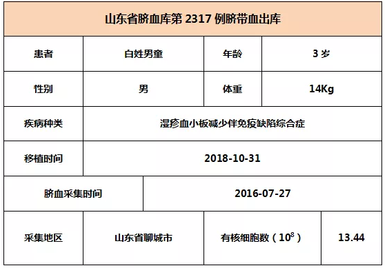 2018年10月31日,3岁白姓男童因患湿疹血小板减少伴免疫缺陷综合征,在河北某三甲医院接受脐带血移植,本次移植的脐带血与患者5/6位点相合,有核细胞数为13.44*10^8。整个输注过程很顺利,无不良反应,愿患者早日恢复健康。