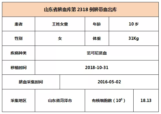 2018年10月31日,10岁王姓女童因患范可尼贫血,在安徽某三甲医院接受脐带血移植,本次移植的脐带血与患者8/10位点相合,有核细胞数为18.13*10^8。整个输注过程很顺利,无不良反应,愿患者早日恢复健康。
