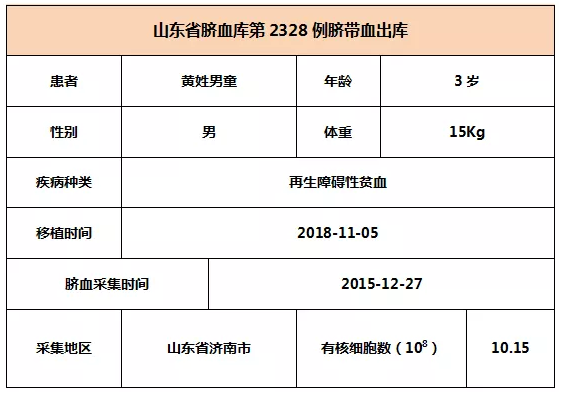 2018年11月05日,3岁黄姓男童因患再生障碍性贫血,在湖北某三甲医院接受脐带血移植,本次移植的脐带血与患者5/10位点相合,有核细胞数为10.15*10^8。整个输注过程很顺利,无不良反应,愿患者早日恢复健康。