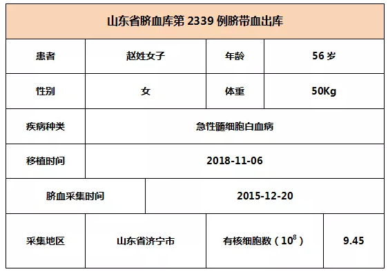 2018年11月06日,56岁赵姓女子因患急性髓细胞白血病,在新疆某三甲医院接受脐带血移植,本次移植的脐带血与患者7/10位点相合,有核细胞数为9.45*10^8。整个输注过程很顺利,无不良反应,愿患者早日恢复健康。