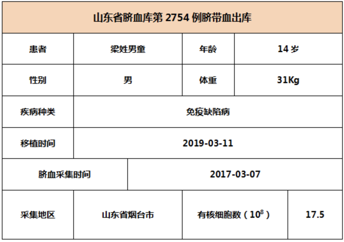 2019年3月11日,14岁梁姓男童因患免疫缺陷病,在上海某三甲医院接受脐带血移植,本次移植的脐带血与患者7/10位点相合,有核细胞数为17.5*10^8。整个输注过程很顺利,无不良反应,愿患者早日恢复健康。