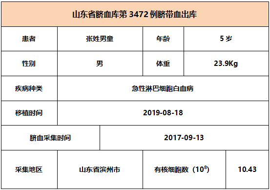 2019年8月18日,5岁张姓男童因患急性淋巴细胞白血病,在河北某三甲医院接受脐带血移植,本次移植的脐带血与患者5/6位点相合,有核细胞数为10.43*10^8。整个输注过程很顺利,无不良反应,愿患者早日恢复健康。