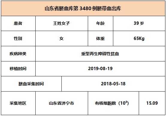 2019年8月19日,39岁王姓女子因患重型再生障碍性贫血,在山东某三甲医院接受脐带血移植,本次移植的脐带血与患者7/10位点相合,有核细胞数为15.09*10^8。整个输注过程很顺利,无不良反应,愿患者早日恢复健康。