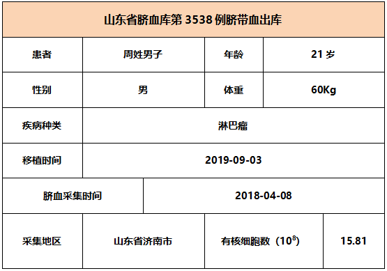 2019年9月3日,21岁周姓男子因患淋巴瘤,在上海某三甲医院接受脐带血移植,本次移植的脐带血与患者4/6位点相合,有核细胞数为15.81*10^8。整个输注过程很顺利,无不良反应,愿患者早日恢复健康。