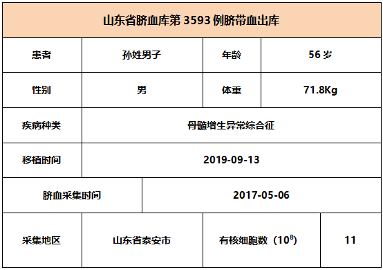 2019年9月13日,56岁孙姓男子因患骨髓增生异常综合征,在河北某三甲医院接受脐带血移植,本次移植的脐带血与患者5/6位点相合,有核细胞数为11*10^8。整个输注过程很顺利,无不良反应,愿患者早日恢复健康。