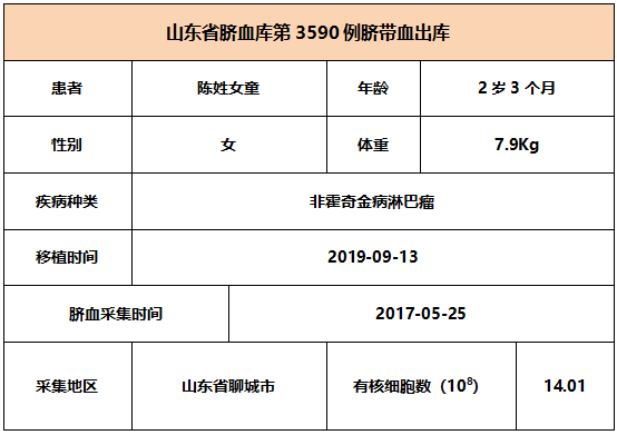 2019年9月13日,2岁三个月大陈姓女童因患非霍奇金病淋巴瘤,在广东某三甲医院接受单份脐带血移植,本次移植的脐带血与患者8/10位点相合,有核细胞数为14.01*10^8。整个输注过程很顺利,无不良反应,愿患者早日恢复健康。