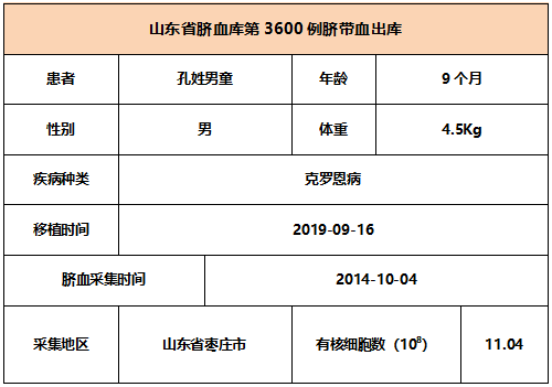 2019年9月16日,9个月大孔姓男童因患克罗恩病,在浙江某三甲医院接受单份脐带血移植,参与本次移植的脐带血与患者8/10位点相合,有核细胞数为11.04*10^8。整个输注过程很顺利,无不良反应,愿患者早日恢复健康。