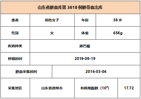 2019年9月19日,38岁高姓女子因患淋巴瘤,在河北某三甲医院接受脐带血移植,本次移植的脐带血与患者4/6位点相合,有核细胞数为17.72*10^8。整个输注过程很顺利,无不良反应,愿患者早日恢复健康。