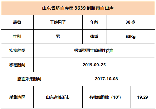 2019年9月25日,38岁王姓男子因患极重型再生障碍性贫血,在山东某三甲医院接受脐带血移植,参与本次移植的脐带血与患者5/10位点相合,有核细胞数为19.29*10^8。整个输注过程很顺利,无不良反应,愿患者早日恢复健康。