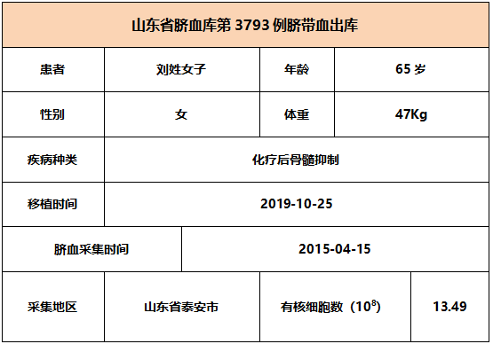 2019年10月25日,65岁刘姓女子因患化疗后骨髓抑制,在陕西某三甲医院接受脐带血移植,本次移植的脐带血与患者4/6位点相合,有核细胞数为13.49*10^8。整个输注过程很顺利,无不良反应,愿患者早日恢复健康。