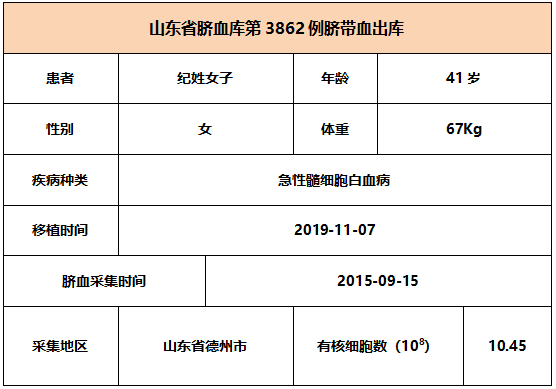2019年11月7日,41岁纪姓女子因患急性髓细胞白血病,在北京某三甲医院接受脐带血移植,本次移植的脐带血与患者8/10位点相合,有核细胞数为10.45*10^8。整个输注过程很顺利,无不良反应,愿患者早日恢复健康。