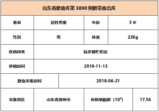 2019年11月13日,5岁刘姓男童因患粘多糖贮积症,在河北某三甲医院接受单份脐带血移植,本次移植的脐带血与患者9/10位点相合,有核细胞数为17.56*10^8。整个输注过程很顺利,无不良反应,愿患者早日恢复健康。