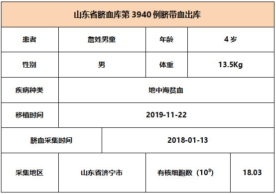 2019年11月22日,4岁詹姓男童因患地中海贫血,在广东某三甲医院接受脐带血移植,本次移植的脐带血与患者7/10位点相合,有核细胞数为18.03*10^8。整个输注过程很顺利,无不良反应,愿患者早日恢复健康。