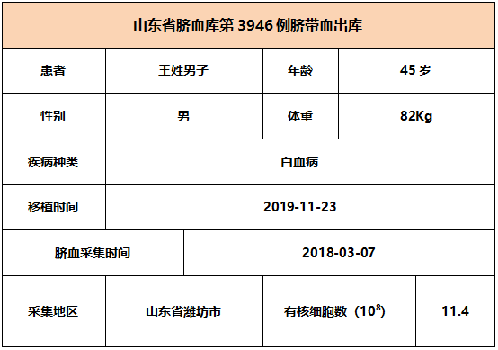 2019年11月23日,45岁王姓男子因患白血病,在天津某三甲医院接受脐带血移植,本次移植的脐带血与患者7/10位点相合,有核细胞数为11.4*10^8。整个输注过程很顺利,无不良反应,愿患者早日恢复健康。