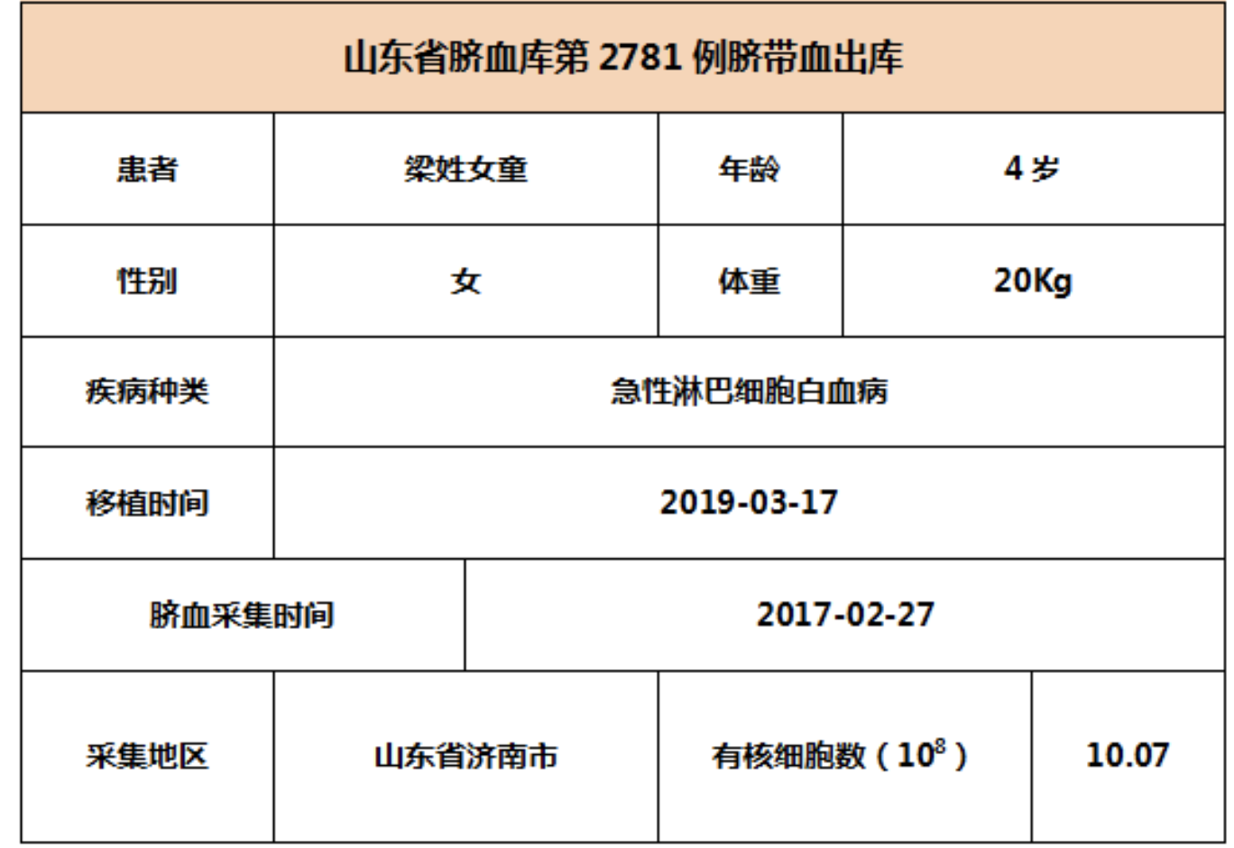 2019年3月17日,4岁梁姓女童因患急性淋巴细胞白血病,在河北某三甲医院接受脐带血移植,本次移植的脐带血与患者7/10位点相合,有核细胞数为10.07*10^8。整个输注过程很顺利,无不良反应,愿患者早日恢复健康。
