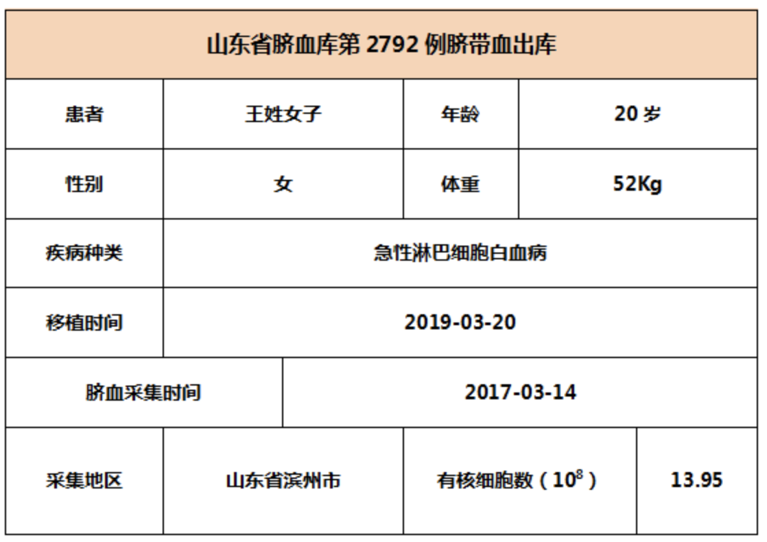 2019年3月20日,20岁王姓女子因患急性淋巴细胞白血病,在湖南某三甲医院接受脐带血移植,本次移植的脐带血与患者5/10位点相合,有核细胞数为13.95*10^8。整个输注过程很顺利,无不良反应,愿患者早日恢复健康。