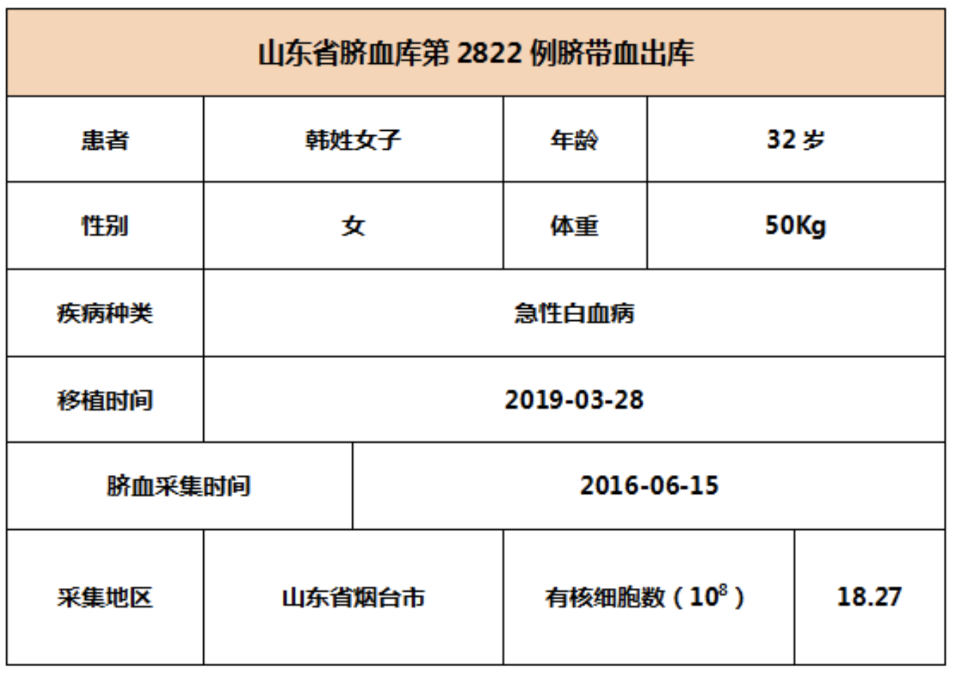 2019年3月28日,32岁韩姓女子因患急性白血病,在北京某三甲医院接受脐带血移植,本次移植的脐带血与患者6/10位点相合,有核细胞数为18.27*10^8。整个输注过程很顺利,无不良反应,愿患者早日恢复健康。