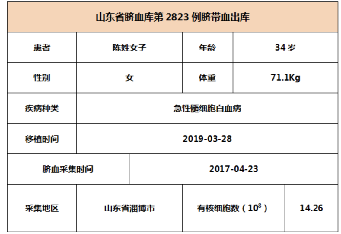 2019年3月28日,34岁陈姓女子因患急性髓细胞白血病,在浙江某三甲医院接受脐带血移植,本次移植的脐带血与患者5/6位点相合,有核细胞数为14.26*10^8。整个输注过程很顺利,无不良反应,愿患者早日恢复健康。