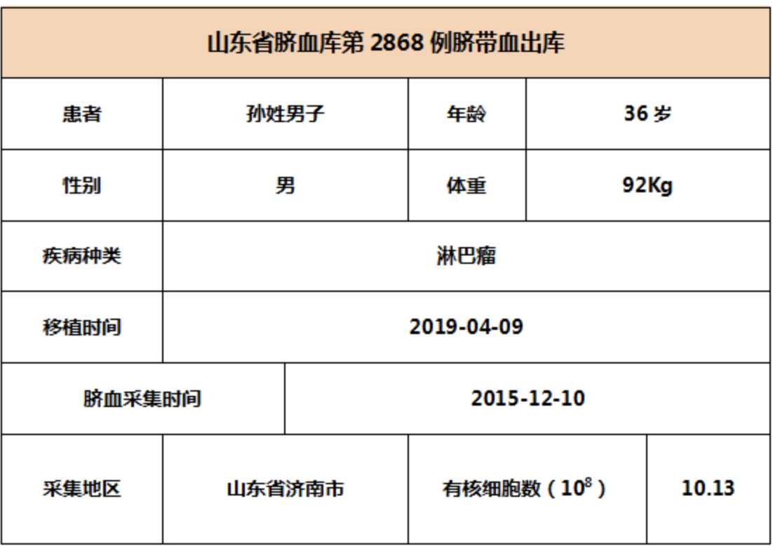 2019年4月9日,36岁孙姓男子因患淋巴瘤,在北京某三甲医院接受脐带血移植,本次移植的脐带血与患者7/10位点相合,有核细胞数为10.13*10^8。整个输注过程很顺利,无不良反应,愿患者早日恢复健康。