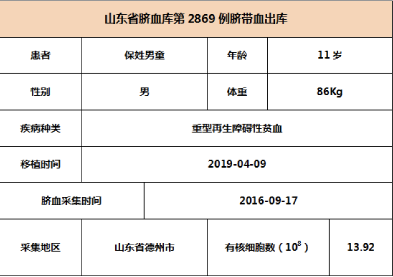 2019年4月9日,11岁保姓男童因患重型再生障碍性贫血,在云南某三甲医院接受单份脐带血移植,本次移植的脐带血与患者4/6位点相合,有核细胞数为13.92*10^8。整个输注过程很顺利,无不良反应,愿患者早日恢复健康。