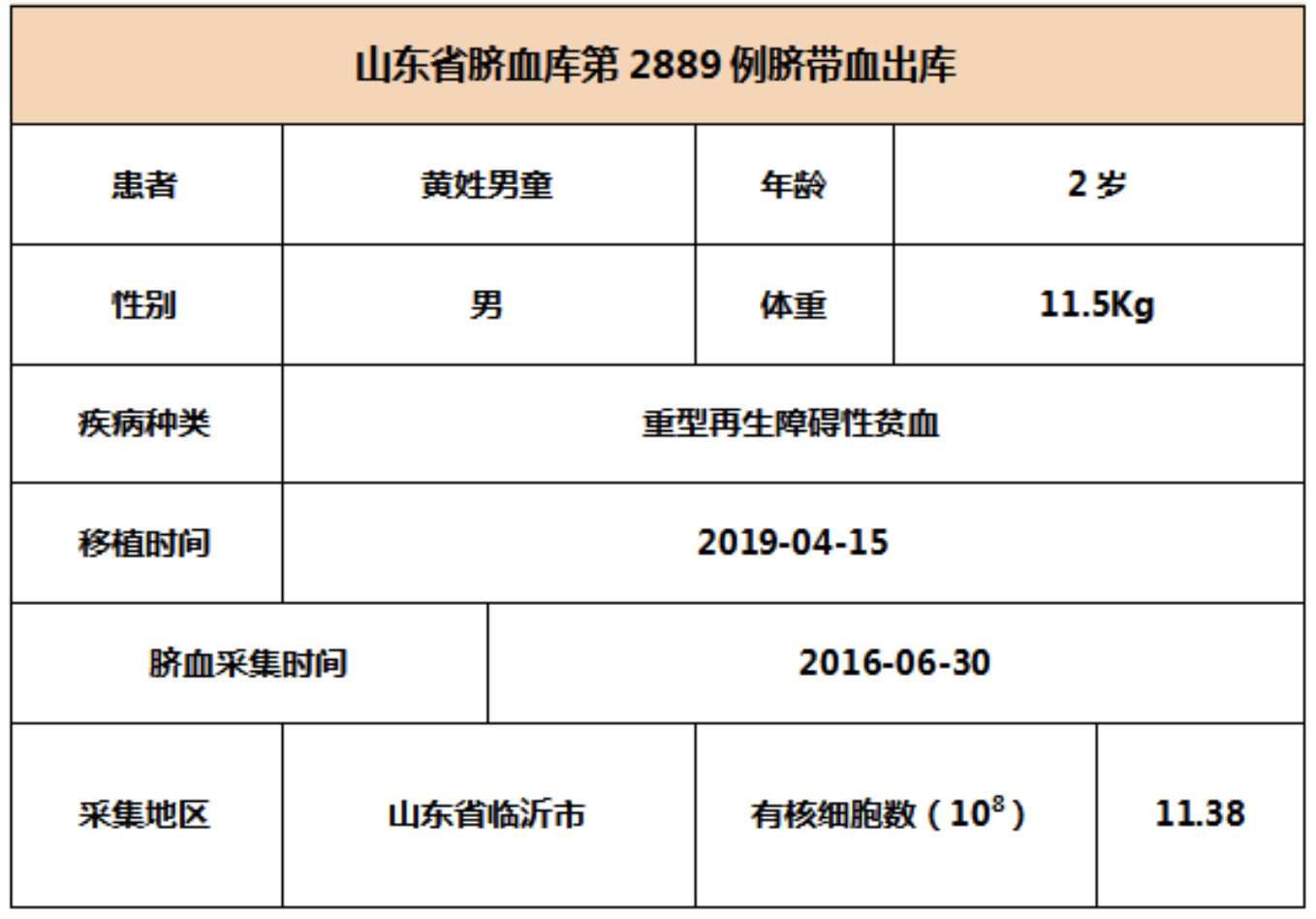 2019年4月15日,2岁黄姓男童因患重型再生障碍性贫血,在安徽某三甲医院接受脐带血移植,本次移植的脐带血与患者7/10位点相合,有核细胞数为11.38*10^8。整个输注过程很顺利,无不良反应,愿患者早日恢复健康。
