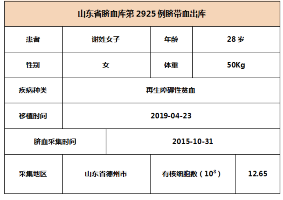 2019年4月23日,28岁谢姓女子因患再生障碍性贫血,在河南某三甲医院接受脐带血移植,本次移植的脐带血与患者7/10位点相合,有核细胞数为12.65*10^8。整个输注过程很顺利,无不良反应,愿患者早日恢复健康。
