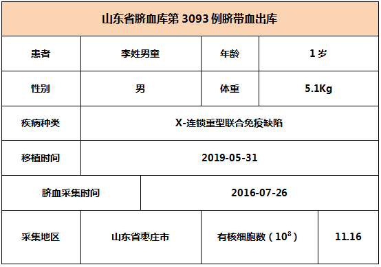 2019年5月31日,1岁李姓男童因患X-连锁重型联合免疫缺陷,在北京某三甲医院接受脐带血移植,本次移植的脐带血与患者9/10位点相合,有核细胞数为11.16*10^8。整个输注过程很顺利,无不良反应,愿患者早日恢复健康。