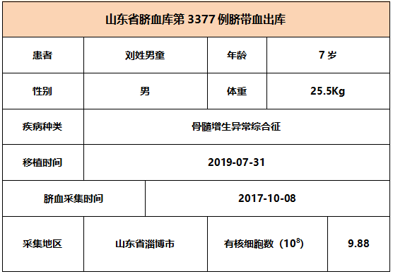 2019年7月31日,7岁刘姓男童因患骨髓增生异常综合征,在河北某三甲医院接受脐带血移植,本次移植的脐带血与患者4/6位点相合,有核细胞数为9.88*10^8。整个输注过程很顺利,无不良反应,愿患者早日恢复健康。