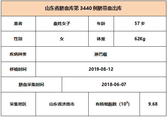 2019年8月12日,57岁秦姓女子因患淋巴瘤,在上海某三甲医院接受脐带血移植,本次移植的脐带血与患者8/10位点相合,有核细胞数为9.68*10^8。整个输注过程很顺利,无不良反应,愿患者早日恢复健康。